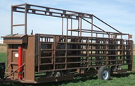 The corral is equipped with one large cylinder on the front to raise and lower the frame. It can be purchased with a 12V electric over hydraulic power unit and solar charger or a hydraulic only unit that can be used with a bale bed, tractor, or auxiliary power unit. It features an adjustable hitch with a 2-5/16” ball mount. The corral weighs 8200 pounds.