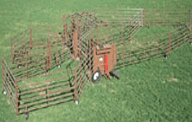 The "Duke" wheel corral by Blattner Feedlot Construction is full of features to make your job safer and easier. The corral features a large catch pen on one side and “bud box’ or smaller pen on the other. When loading or processing; the sheeted gate helps direct the flow of cattle down the alley way. The alley has two 4’ cut gates and two palpation or access gates on the end. The heavy duty frame work makes up the alley for a more rigid and longer lasting corral. The wheeled panels ride on platforms of the frame to protect the wheels and tires from damage when going through driveways, fields, and dips.